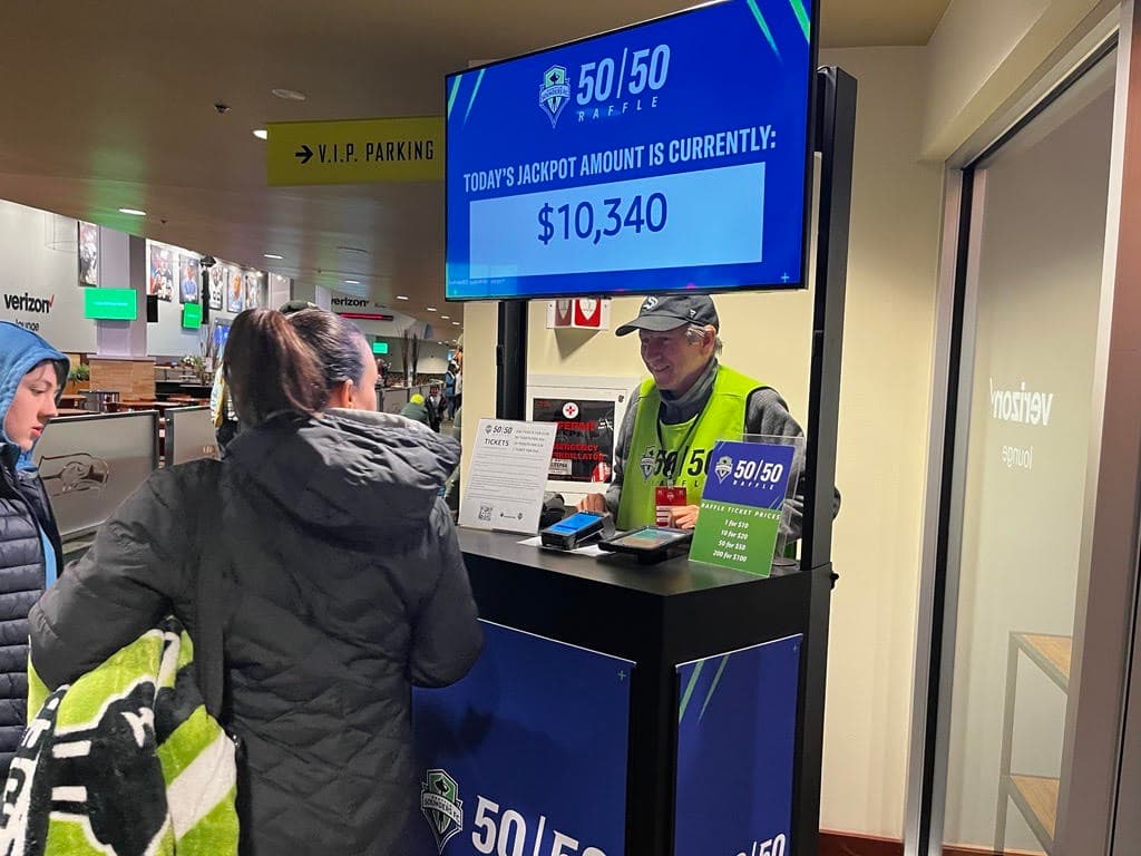 To purchase raffle tickets, ticketed fans can look for Sounders FC 50/50 sellers at kiosk locations throughout Lumen Field. An updated jackpot will be projected during the game on stadium signage and on all raffle ticket kiosks. Raffle ticket sales begin when gates open, and conclude after minute 50 of each match.